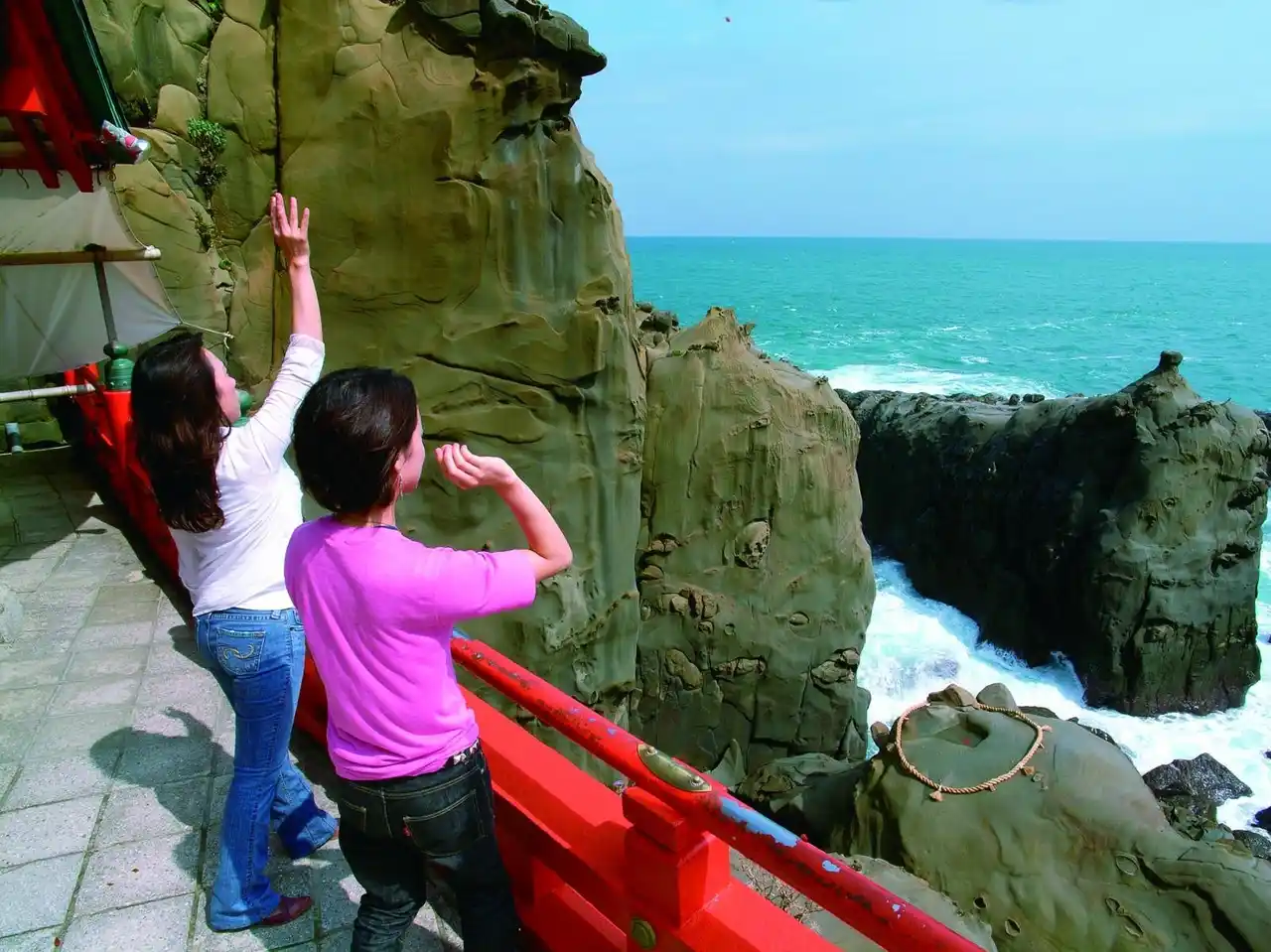 日南海岸の断崖に位置し、洞窟内に本殿を構える全国的にも珍しい神社です。主祭神はウガヤフキアエズノミコトで、日本神話に登場する人物として知られています。朱塗りの社殿と青い海、岩窟の地形が織りなす景観は、日本の自然信仰を象徴する風景の一つです。 |