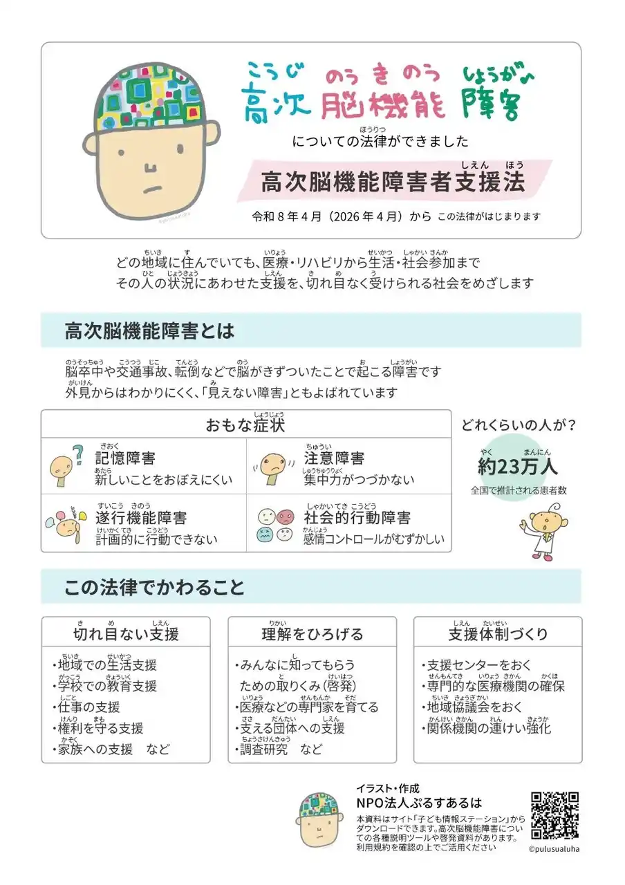 「子どもも大人もイラストで学ぶ高次脳機能障害」ぷるすあるはが運営するサイト「子ども情報ステーション」に掲載。無料でダウンロードできる。このほか、症状を伝えるカード、子どもの高次脳機能障害リーフレットなどを掲載。 |