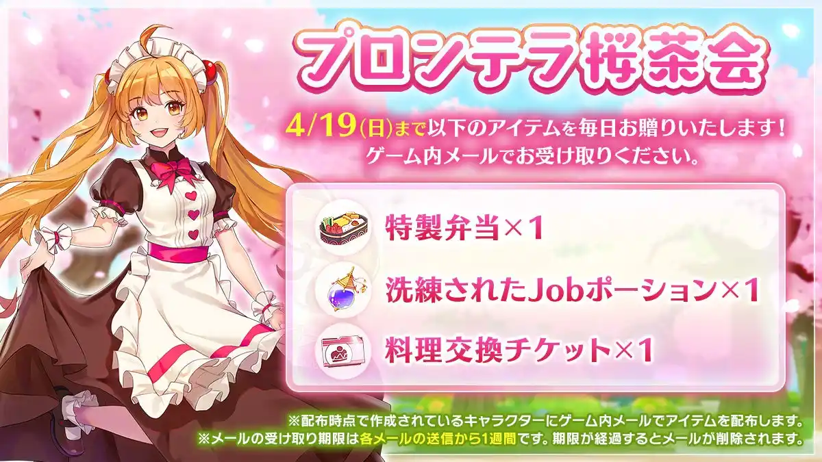 桜の下で羽を休めるのにぴったりなアイテムを毎日お届け。期間中、ゲーム内メールにて「特製弁当」や「洗練されたJobポーション」、「料理交換チケット」といった回復・成長アイテムを配布します。 |