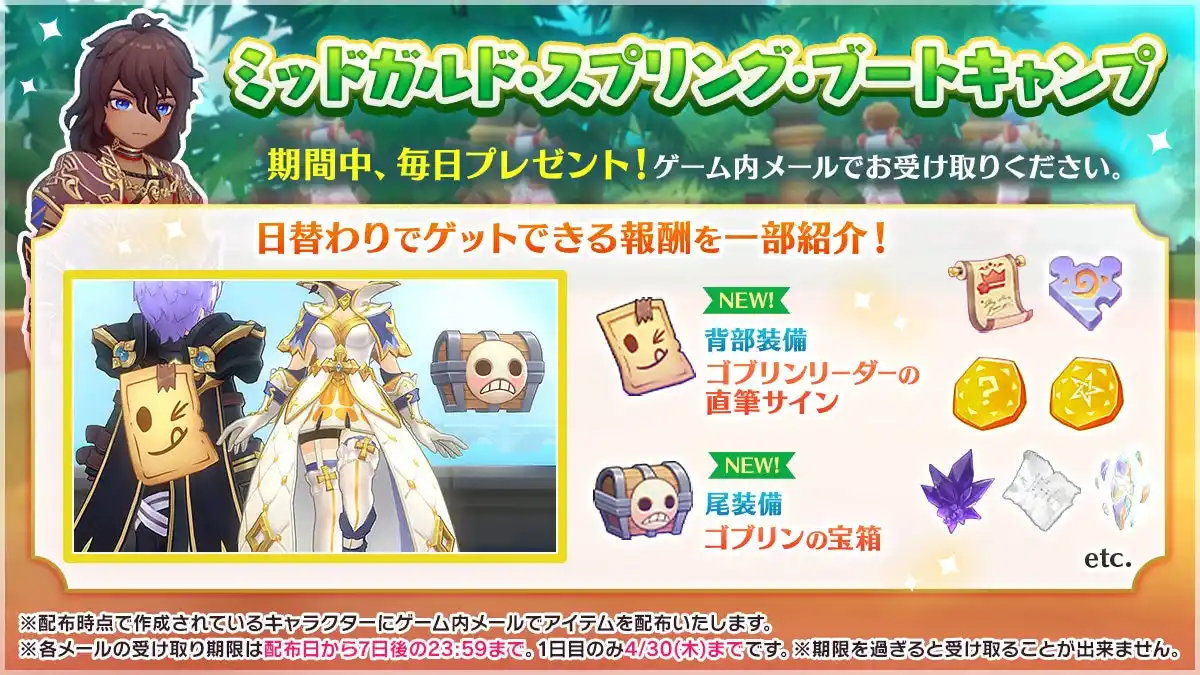 新登場の背部装備「ゴブリンリーダーの直筆サイン」や尾装備「ゴブリンの宝箱」といった装備品や強化素材などが日替わりで手に入ります。 |