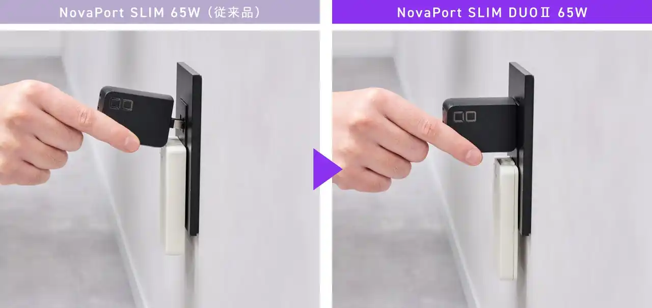 本製品は、薄型充電器の携帯性はそのままに、従来の90°プラグでは使いにくかったコンセント環境への対応力を高めたUSB充電器です。プラグ位置の見直しにより、本体端部から180°開閉する構造を実現。低い位置のコンセントや壁際、限られたスペースでも使いやすく、外出先での充電体験をより快適にします。 また、USB-Cを2ポート搭載し、65WモデルはノートPCまで対応する高出力設計、45Wモデルはより軽量・コンパクトに使いやすさを高めた仕様です。さらに、接続機器に応じて最適な電力配分を行う「NovaIntelligence」や、安全保護機能「NovaSafety2.0」も搭載し、薄さ・使いやすさ・充電性能を高次元で両立しました。 |