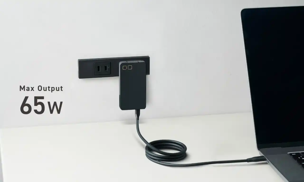 65Wは厚さ約12.3mmの極薄設計を実現。バッグやポーチにも収まりやすく、携帯時のかさばりを抑えます。さらに、壁面に沿いやすいフラット形状により、ホテルやカフェ、新幹線・バスなど限られた空間でも安定して使いやすい仕様です。 |