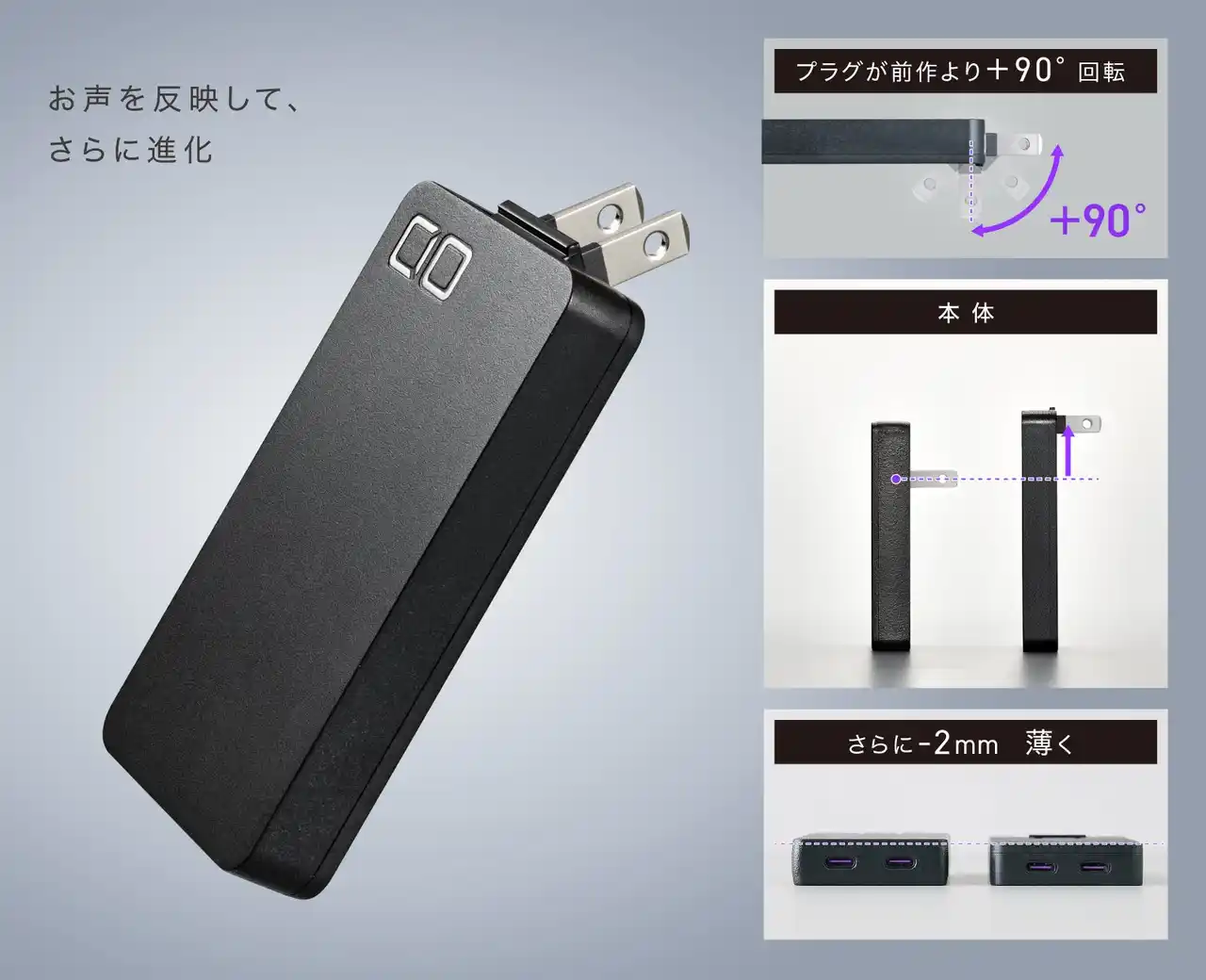 本体端部に配置したプラグが180°回転する独自構造です。従来の90°プラグでは干渉しやすかった低い位置のコンセントや壁際、家具まわりなどにも差し込みやすく、これまで使いにくかった場所でも快適に使用できます。単なるギミックではなく、使える場所そのものを広げるための設計です。 |