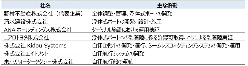 野村不動産株式会社(代表事業者、本社:東京都港区/代表取締役社長:松尾大作)、清水建設株式会社(本社:東京都中央区/取締役社長:新村達也)、ANA ホールディングス株式会社(本社:東京都港区/代表取締役社長:芝田浩二)、エアロトヨタ株式会社(本社:東京都江東区/代表取締役社長:加藤浩士)、株式会社Kidou