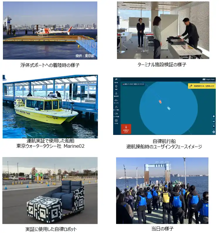 2025 年12 月には、本事業において2 度目となる実証実験を行い、外海に設置した浮体式ポートでの空飛ぶクルマを想定したヘリコプターによる離着陸実証や自律航行船※3 による運航実証に成功したほか、ターミナル施設でのオペレーションの検証や各モビリティの相互連携を支援するシームレスコネクティングシステム※4 の動作検証、複数台の自律ロボットによる運行実証などを実施いたしました。 |