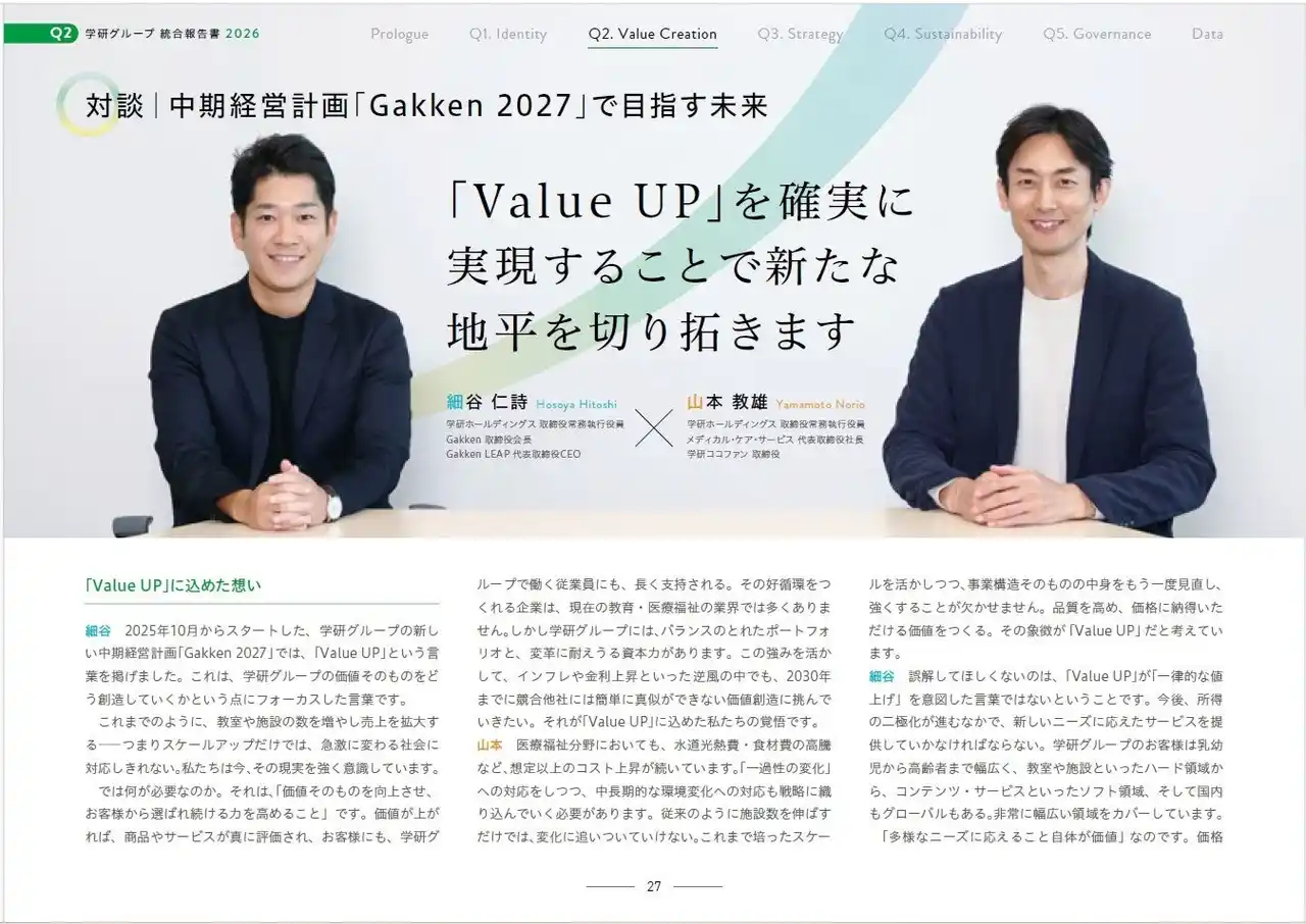 | 学研グループは2026年4月1日に創業80周年を迎えます。また、2025年10月には2か年の中期経営計画「Gakken 2027 ~Value UP~」をスタートしました。本報告書では、こうした大きな節目を背景に、学研グループのこれまでの歩みと価値創造の考え方、今後の成長戦略を一冊にまとめています。 | |||