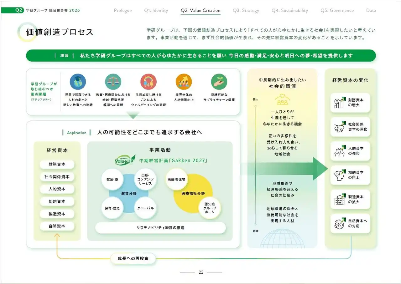 | 本報告書では、学研グループの存在意義や持続可能な価値創造の仕組み、事業戦略、サステナビリティ、ガバナンスについて、「5つの問い」を軸に体系的に解説するとともに、グループ各社の事業や取り組みを幅広く掲載し、学研グループ全体での価値創造の姿を具体的にお示ししています。 | |||