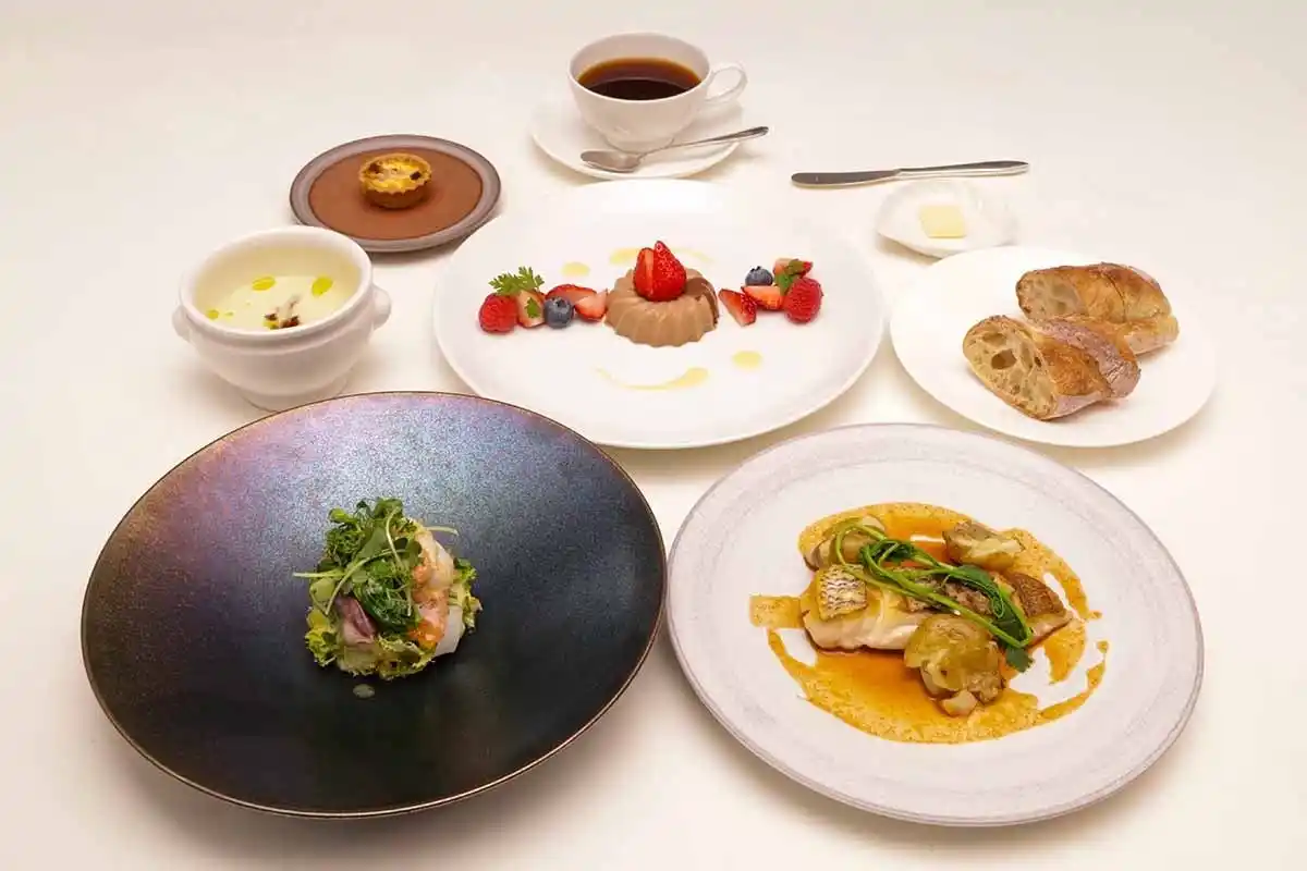 | 春のメニューでは、旬のホタルイカや帆立、春キャベツのポタージュなど、芽吹きを感じる品々をご用意しました。 メインディッシュは、噛むほどに旨味あふれる「能登豚の鉄板ロースト」や、濃厚なビスクソースが絶品の「鯛のポワレ」など、3種から選べるスタイル。ホテルならではの洗練された味わいを、カジュアルにお楽しみいただけます。 | ||||||||||||||||