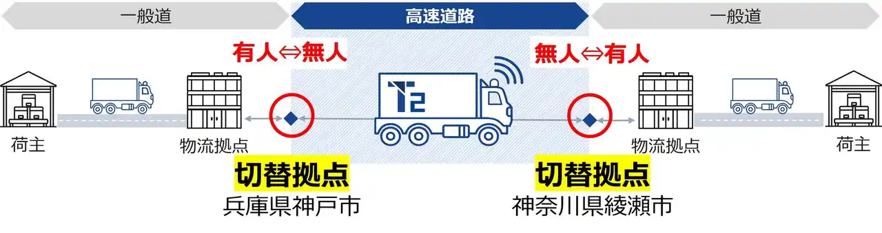 | 上記の綾瀬スマートICおよび神戸西ICの近くには、T2が、レベル4を見据えて、高速道路における自動運転と、一般道における有人運転を切り替えるためにドライバーがトラックに乗り降りする「切替拠点」*⁶を今春、それぞれ完成させる予定で、今後、こうした切替拠点の間も自動運転のままで走行できるよう、本線からさらに区間を拡げ、▼幅の狭さで走行の難易度が高いとされる料金所の通過に加えて、▼料金所と切替拠点を結ぶ一般道の走行までをも可能にする技術開発を進めてまいります。 | |||||||||