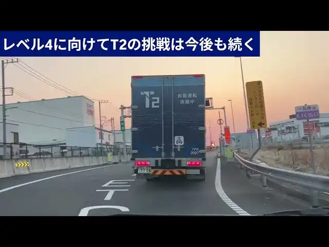 株式会社T2(東京都千代田区、代表取締役CEO:熊部 雅友、以下「T2」)は2026年3月、自社で開発したレベル2*¹自動運転トラックで、関東ー関西を結ぶおよそ500kmの高速道路の本線において、ドライバーによる一時的なハンドル操作を一度も発生させず、自動運転のままで完走*²に成功しました。 自動運転トラックによる500kmにおよぶ長距離の本線完走は国内で初めて*³です。これを基盤に、T2が目指すレベル4*⁴自動運転トラックによる幹線輸送サービスの実現に向けて、イレギュラーな事態を含め、実際の運行を想定したあらゆる場面に対応できる技術開発をさらに前へ進めてまいります。 |