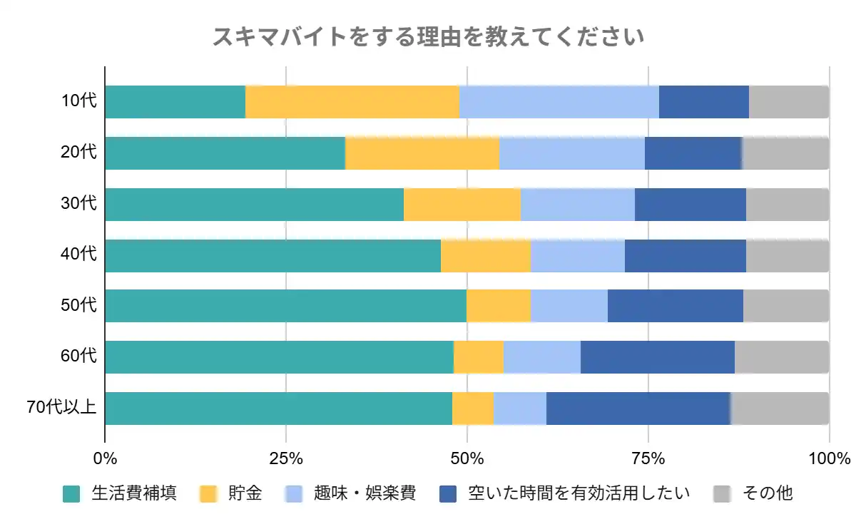 「スキマバイトをする理由を教えてください」という質問に対し、「生活費補填」(38.5%)と回答した方が最も多かった。 |