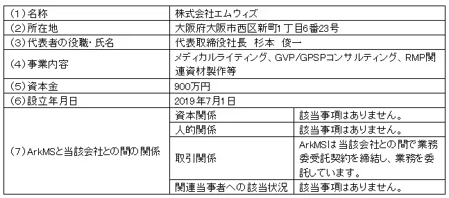 | 当社の子会社であるArkMS株式会社(アークメディカルソリューションズ、本社:東京都豊島区、代表取締役社長:水尾斉、以下「ArkMS」)は、株式会社エムウィズ(本社:大阪府大阪市、代表取締役社長:杉本俊一、以下「エムウィズ」)と、医薬品および医療機器の安全性関連サポート業務とその営業活動に関する業務提携基本契約を締結しましたので、下記のとおりお知らせいたします。 | |||