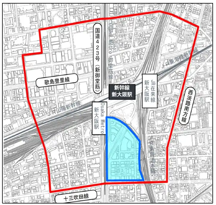 ※赤枠は 2022年10月28日に内閣府より指定された「新大阪駅周辺 都市再生緊急整備地域」 |