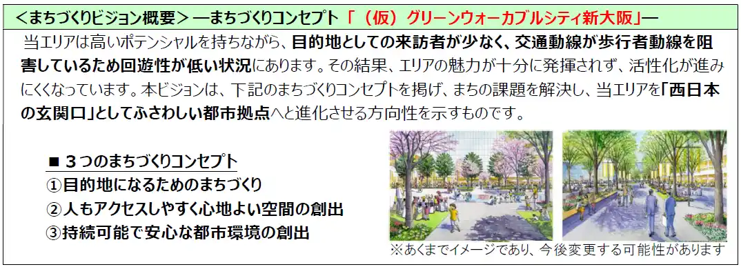 新大阪駅南口エリアまちづくり協議会(以下、「本協議会」という。)はこのたび将来のまちづくりの方向性を示す指針として「新大阪駅南口エリアまちづくりビジョンvol.1」(以下、「本ビジョン」という。)を策定しました。 |