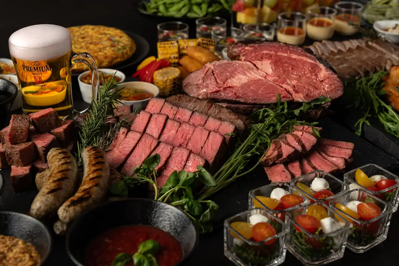 鉄板焼きビーフステーキ/鉄板焼きポークステーキ/鉄板焼きハーブソーセージ/低温調理チキンのクリーミービスクソース/彩グリーンサラダ/バーニャカウダ アンチョビクリームソース/モッツァレラチーズとトマトのカプレーゼ風/白身魚のカダイフ巻き/トルティージャ風スペインオムレツ/アゴーラ黒カレー/チュロス/カスタードプリン/ソフトクリーム/フルーツカクテルヨーグルト/フルーツ(パイナップル・ぶどう・オレンジ・グレープフルーツ)/フルーツゼリーなど |