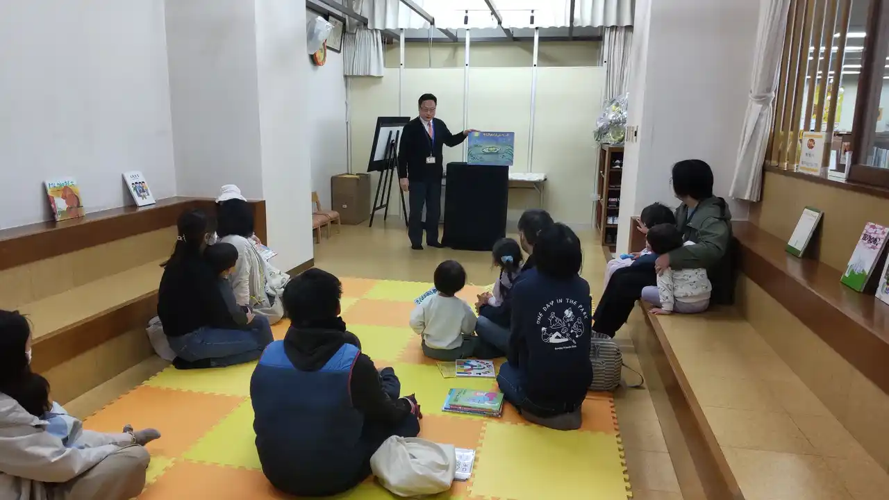 「図書館を身近に感じてもらえるように」と、職員のみなさんと子どもの前に立って、自ら読み聞かせをしてくれる、とてもフラットな館長! だからこそ、子どもが過ごしやすい工夫や子どもが楽しめる企画がいっぱい☆ |