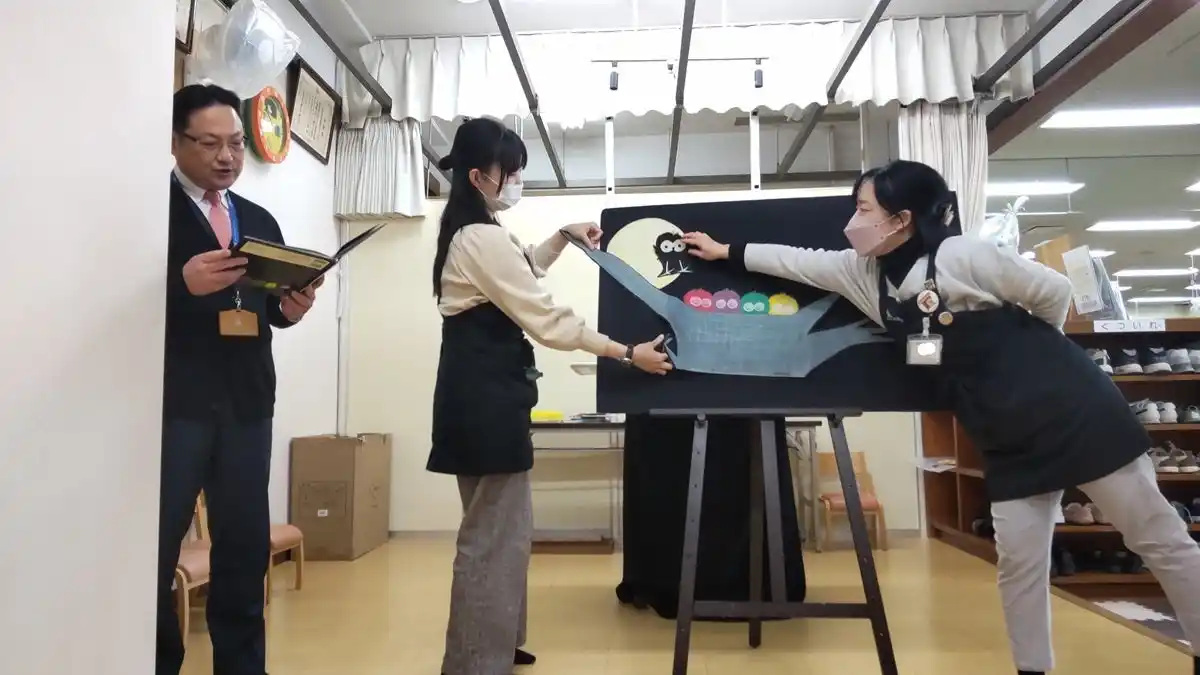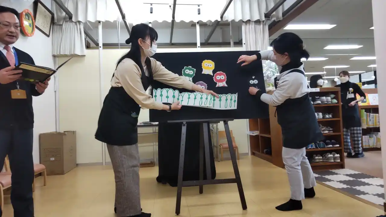 「館長のおはなし会」で登場した「パネルシアター」は、読み聞かせに合わせて、キャラクターや物や背景を職員がひとつひとつ貼りながら場面ごとの挿絵を再現するもの。職員2人がかりでパネルに貼って次の場面の用意をして剥がして貼って・・・、とっても大忙し! |