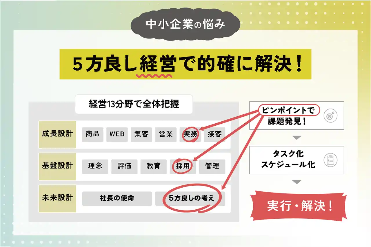 また、当社が提唱する「5方良し経営」の視点から、 会社・従業員・顧客・世間・次世代の5つを同時に良くする経営の考え方を具体的に解説します。 |
