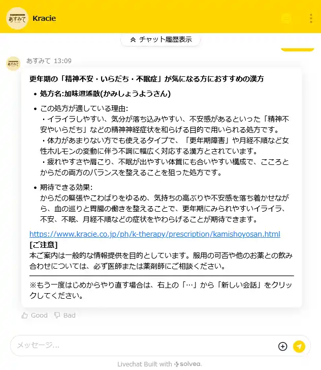 漢方に関する疑問を入力すると、公式サイトの内容をもとにAIが回答する機能を追加。漢方に馴染みがない方でも、気になる点を気軽に質問でき、知りたい情報にスムーズにアクセスできます。 |