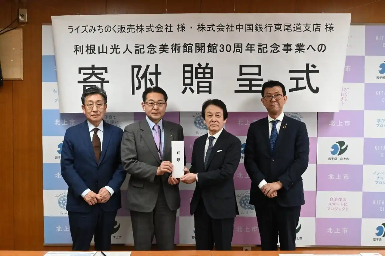 当行では、私募債発行を通じ、地域社会に貢献する企業を応援しております。1月30日(金)に、ライズみちのく販売株式会社の『SDGs私募債「地域応援型」(※)』の引受けと財務代理人を務めました。その手数料の一部を北上市の利根山光人記念美術館開館30周年記念事業に同社と当行の連名にて寄附いたします。 |