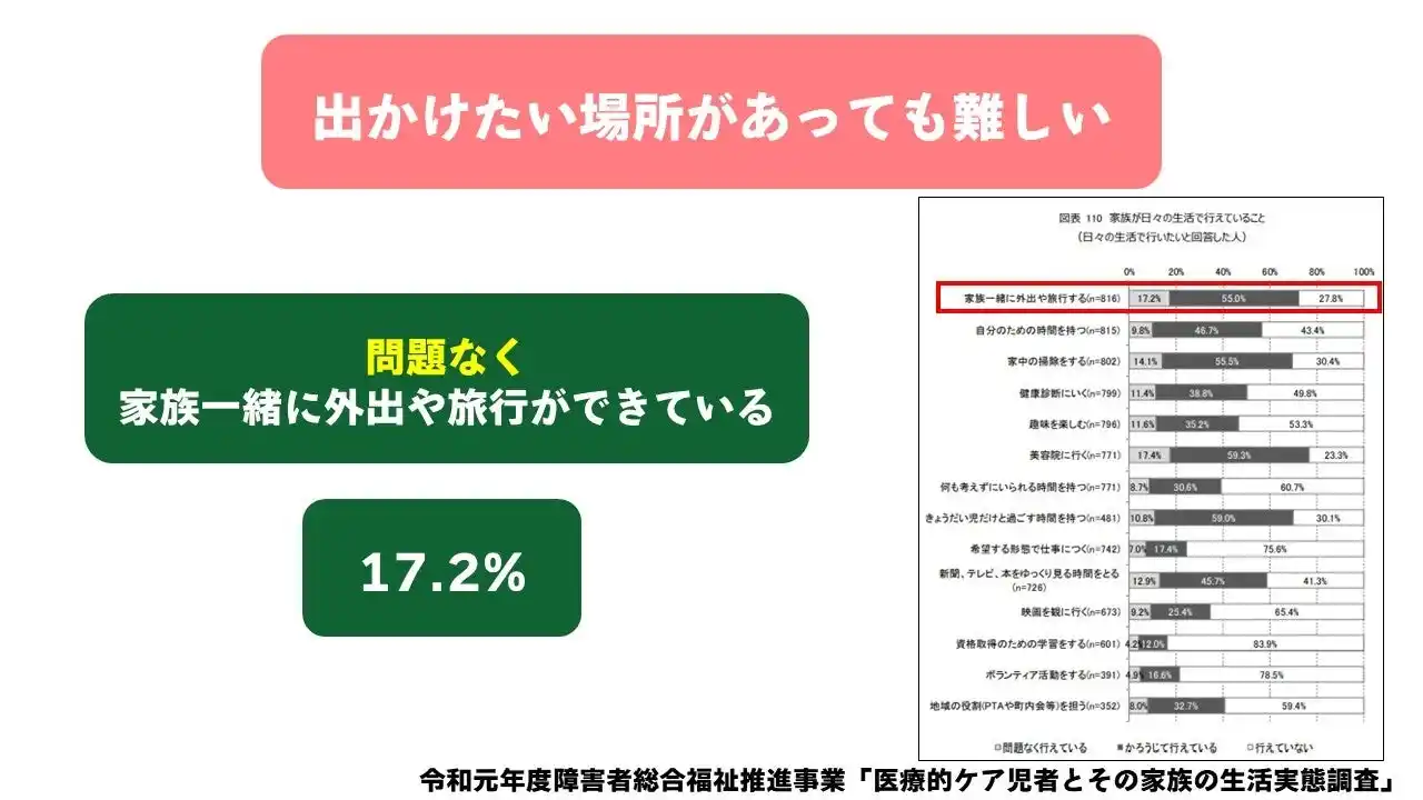 重症心身障がい児や医療的ケア児を育てる家庭では、医療機器の管理、移動負担、食事形態への配慮などの理由から、一般的な外出や外食、季節行事への参加が難しいことが多く、「家族一緒に外出や旅行する」ことに課題を感じているご家族も多いです。 |