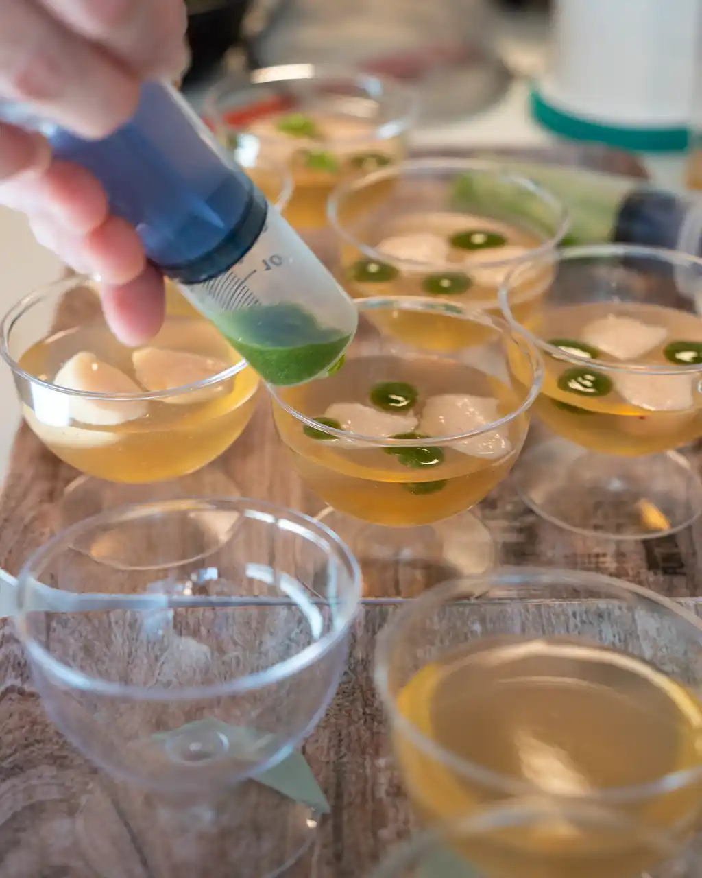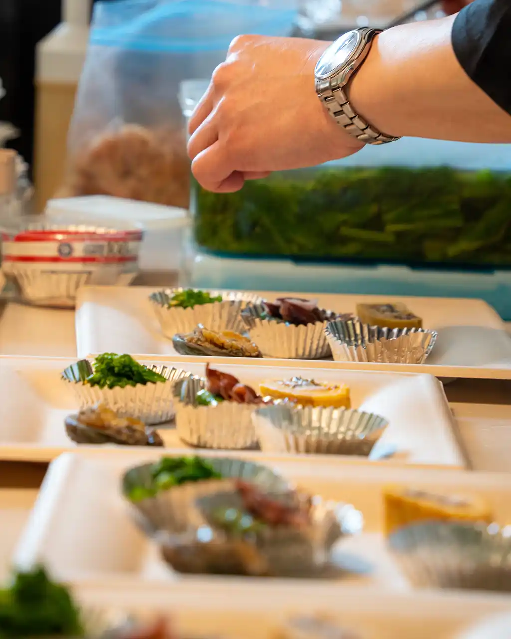 当日は午前中から山本シェフ(旬菜旬魚よねやま:東京都足立区)やペースト加工担当の大高氏とCOCOLONスタッフが、参加者の医療的ケアや食形態に合わせた会場設営や食事の加工、ご家族用のランチの準備を進めました。 |