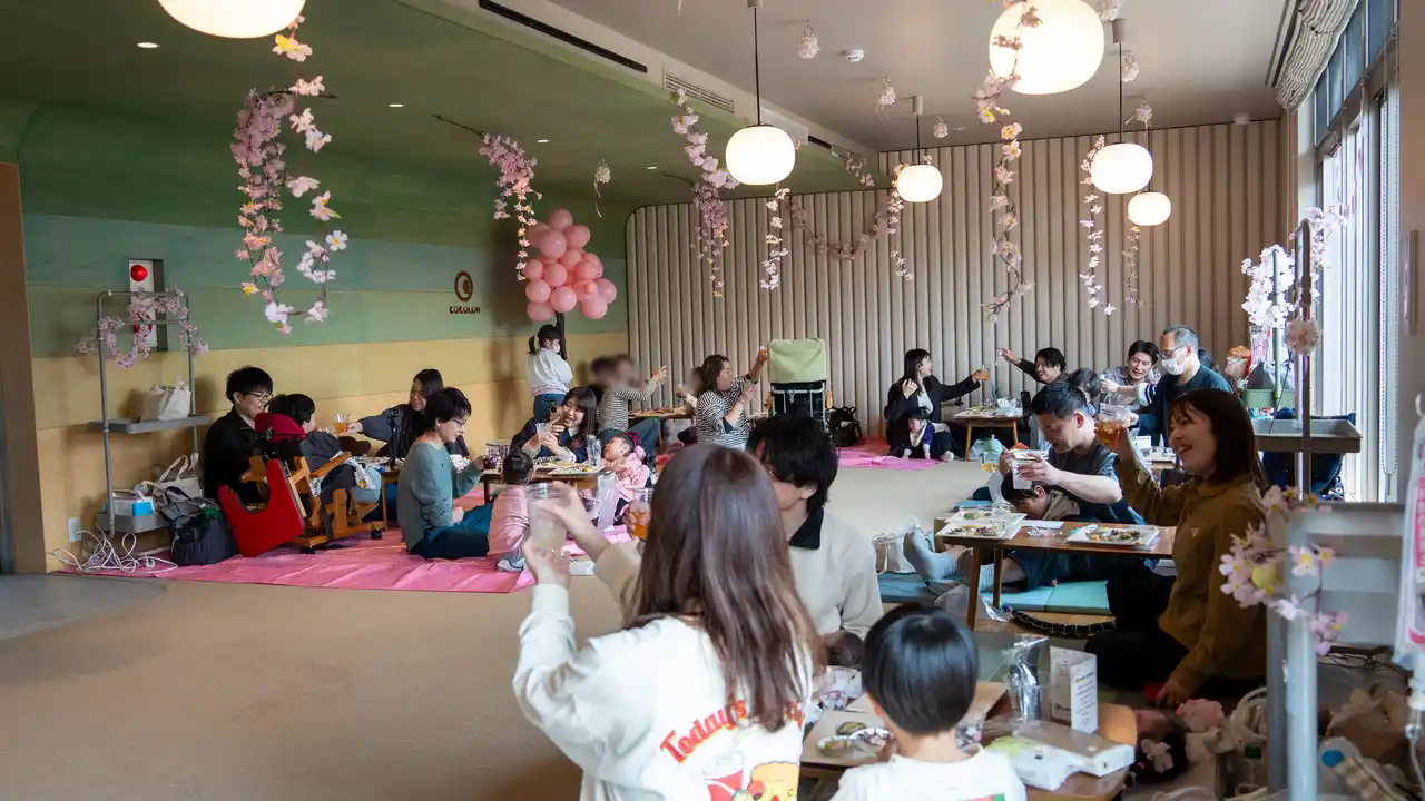 会場は花見の定番である桜の木や、春らしい花の装飾を施し、天候や気温に左右されず、安全で快適な環境の中で春の季節行事を楽しめる場を提供しました。COCOLON BASEはおむつ交換台や医療的ケア用の電源・設備が完備されているので、お子様と一緒に楽しく快適に過ごせます。 |