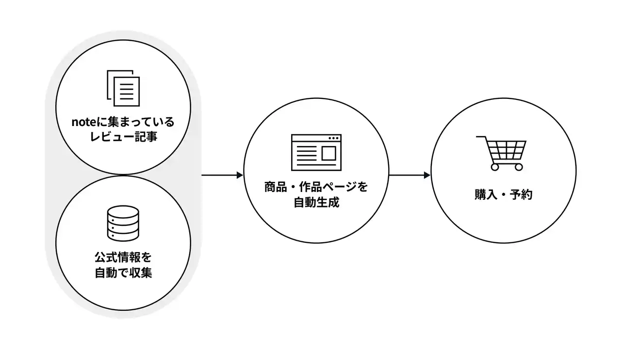 AIコンテクストネットワークは、世の中で公開されている商品・作品の公式情報をAIを活用して自動収集・整理し、note上にそれぞれのページを自動で生成。noteに投稿された関連する感想・レビューを集約し、購入・予約・視聴といった行動へとつなぐ仕組みです。 |