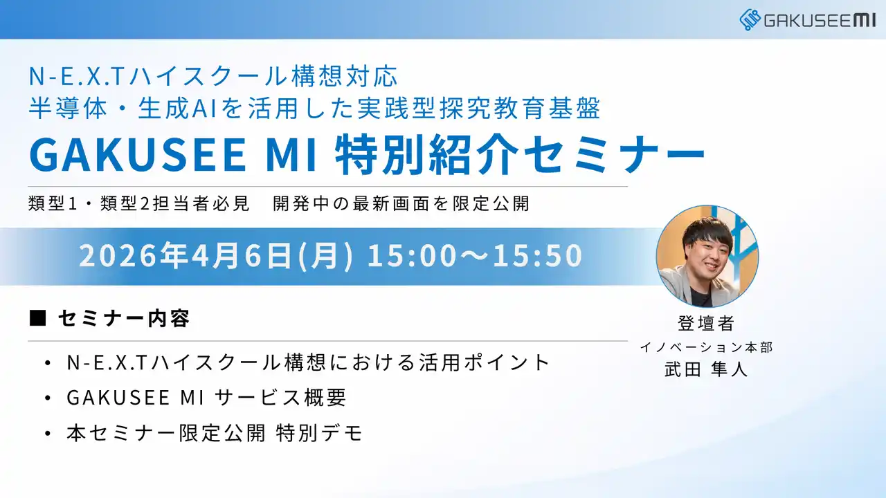 木村情報技術株式会社(本社:佐賀県佐賀市、代表取締役:木村 隆夫、以下「木村情報技術」)は4月6日(月)、半導体と生成AIを活用した実践型探究教育基盤「GAKUSEE MI(ガクシーミー)」の特別紹介セミナーを開催いたします。 |