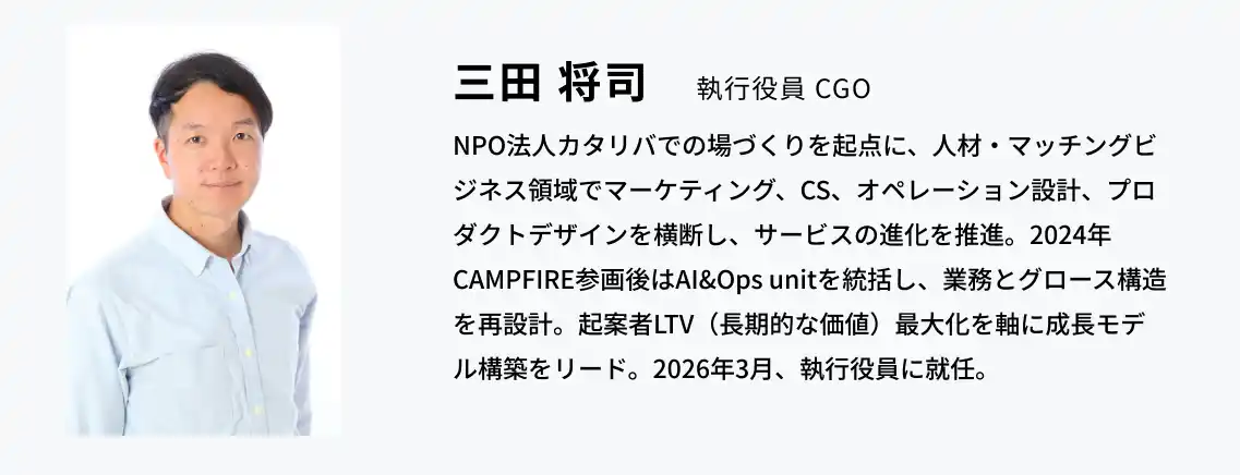 | CAMPFIREは「想いを起点に、あらゆる価値をめぐらせる」ことをミッションに、一人ひとりの想いや役割、可能性を広げる事業を展開しています。今回の体制変更により、これまでCGO(Chief Growth Officer)として事業成長を牽引してきた三田 将司を執行役員として迎えることで、クラウドファンディングにコミュニティやファンマーケティングを融合させた「持続的に発展し続ける成長構造」の構築をさらに加速させます。データと戦略の両面から起案者と支援者の関係性を深めることでプラットフォーム全体の価値循環を最適化し、CAMPFIREが大切にしてきた「個人の小さな想い」に寄り添う姿勢と、組織としての飛躍的な事業成長を高い次元で両立してまいります。 | |||