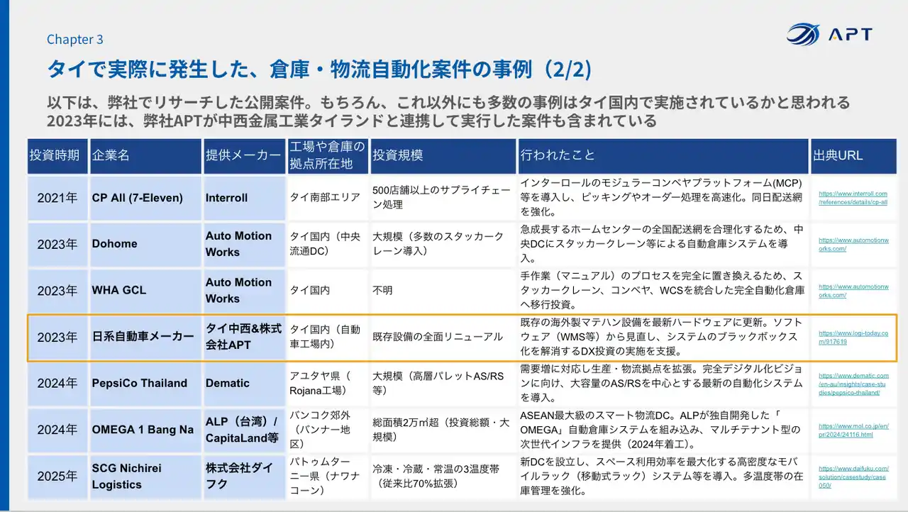 ホワイトペーパーからの抜粋:「タイの物流自動化案件一覧」(一部) |