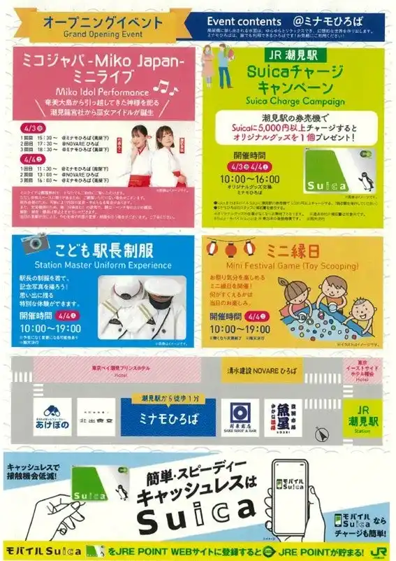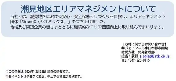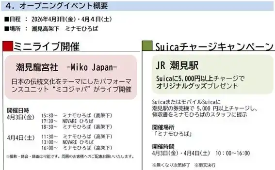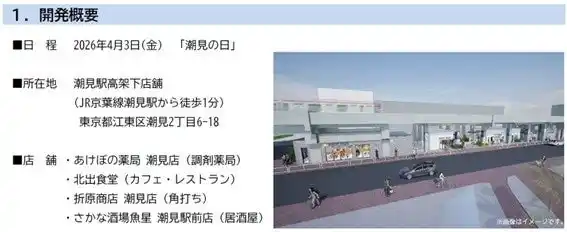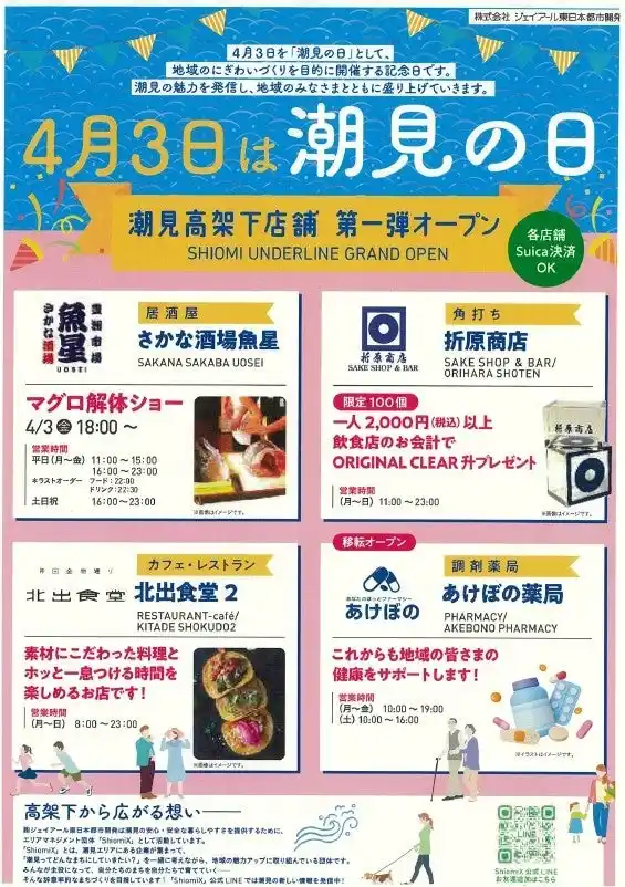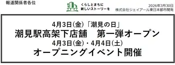 株式会社ジェイアール東日本都市開発(本社:東京都渋谷区代々木2-2-2 代表取締役社長:根本英紀)は、2026年4月3日(金)「潮見の日」に潮見高架下に4店舗開業いたします。本開業により飲食・サービスなど多様な業種が集積し、地域の利便性向上および駅周辺のにぎわい創出を図ってまいります。 また、4月3日(金)・4月4日(土)の2日間、オープニングイベントを開催します。 |