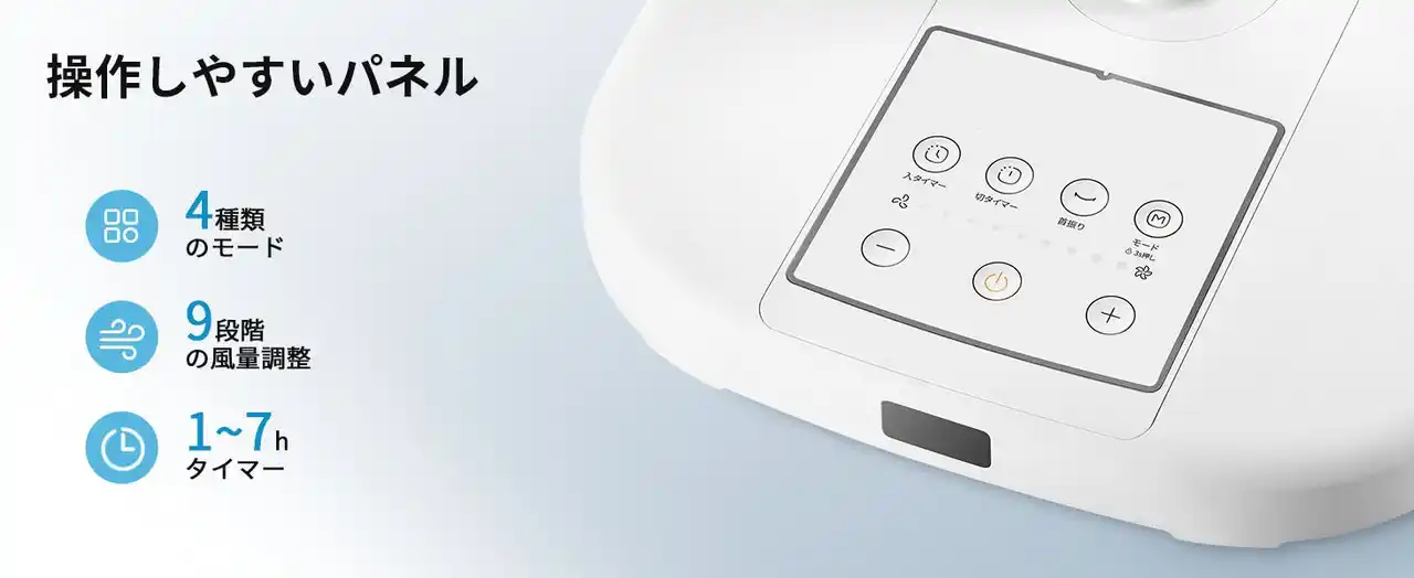 弱・中・強の3段階で風量を調節可能です。お好みに合わせて風の強さを選べます。最大7時間まで設定できる切タイマー機能も搭載し、操作がない場合は自動で電源がオフになり、省エネにも貢献します。 |