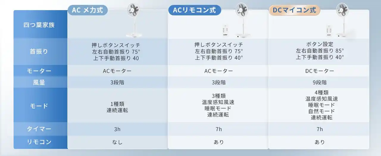 なお、今回ご紹介したモデルのほかにも、同シリーズには「メカ式」と「ACリモコン式」の2モデルもご用意しております。用途やお部屋に合わせて、お好みの1台をお選びください。 |