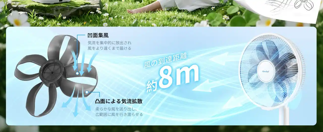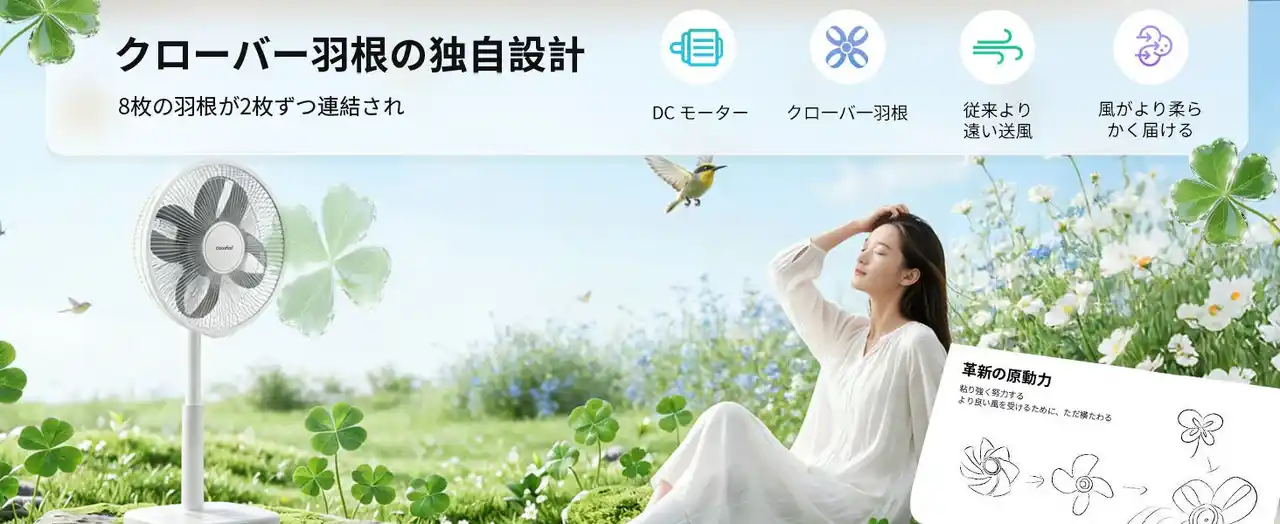 本製品は、クローバー羽の新設計により、より遠くまで届くやさしい風を実現するとともに、静音性と省エネ性にも配慮した設計で、日常のさまざまなシーンにおいて快適な空間づくりをサポートします。 |