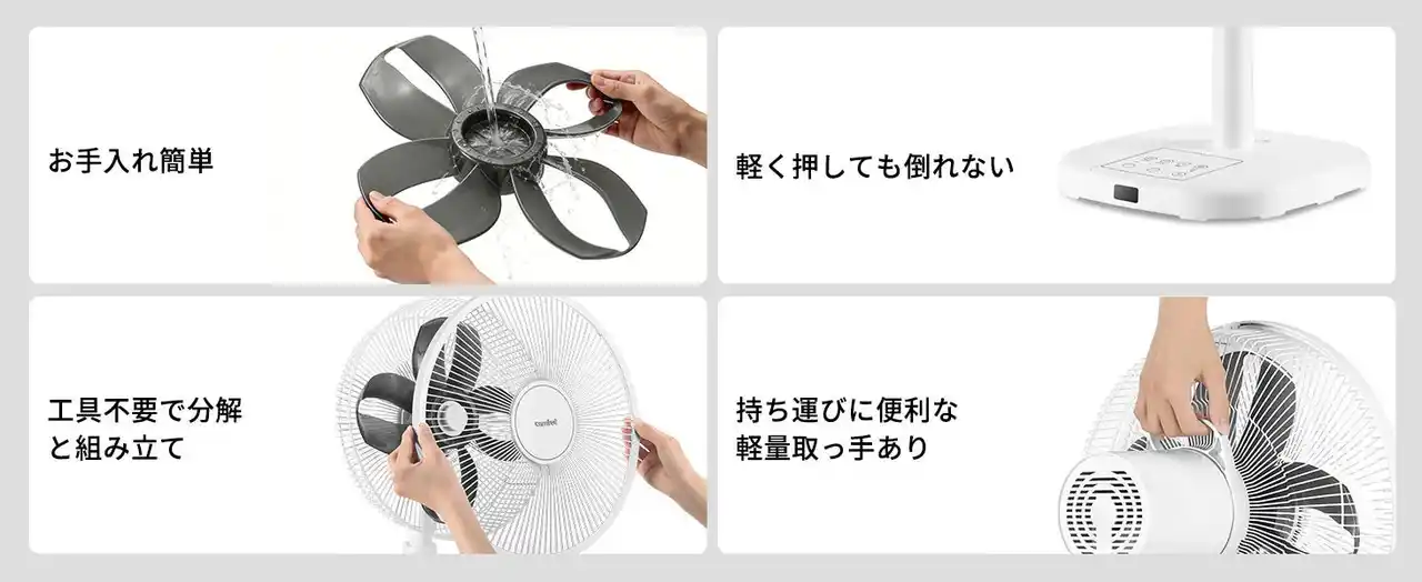 本体は工具不要で簡単に分解・組み立てが可能です。掃除やお手入れも手間なく行えます。持ち運びに便利な軽量取っ手を搭載し、部屋間の移動もスムーズです。さらに、軽く押しても倒れにくい安定設計で、日常の使用でも安心です。 |