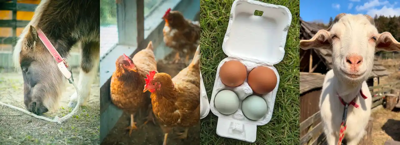 施設内にはヤギやミニチュアホース、鶏などの動物たちが暮らしています。 子どもたちにとっては自然や命に触れる機会になります。 |