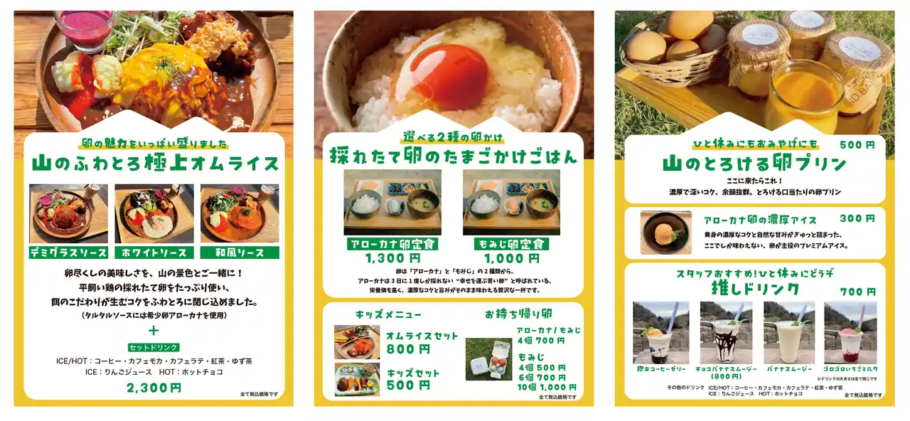 ・ふわっとろ食感のオムライス ・希少卵を使ったたまごかけごはん(TKG) ・濃厚な卵プリン |