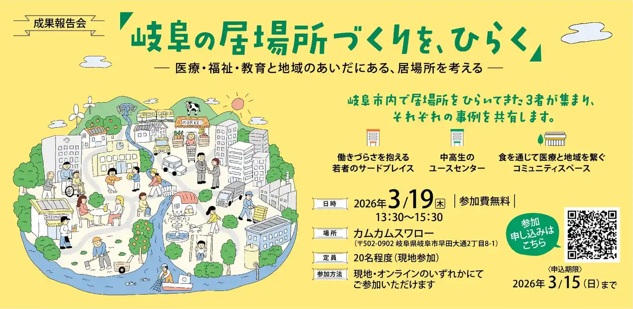 | 2026年3月19日に、オンラインとのハイブリッド形式による成果報告会「岐阜の居場所づくりを、ひらく」が開催されました。一般社団法人サステイナブル・サポートが主催した本イベントには、会場に約20名、オンラインでは約50名の申し込みがあり、居場所づくりへの関心の高さがうかがえました。本記事では、岐阜市内で異なるアプローチから「居場所」をひらいてきた3者の実践報告と、運営のリアルな課題や展望について語り合ったクロストークの模様をお届けします。 | ||||||||||||