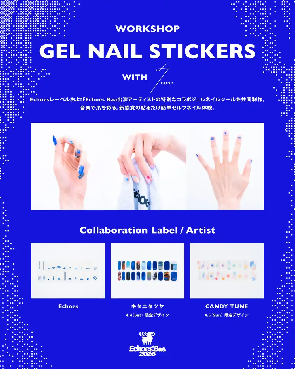 | Echoesレーベルおよび、Echoes Baa出演アーティストの特別コラボジェルネイルシールで、音楽とアートを身にまとう体験を提供します。 |