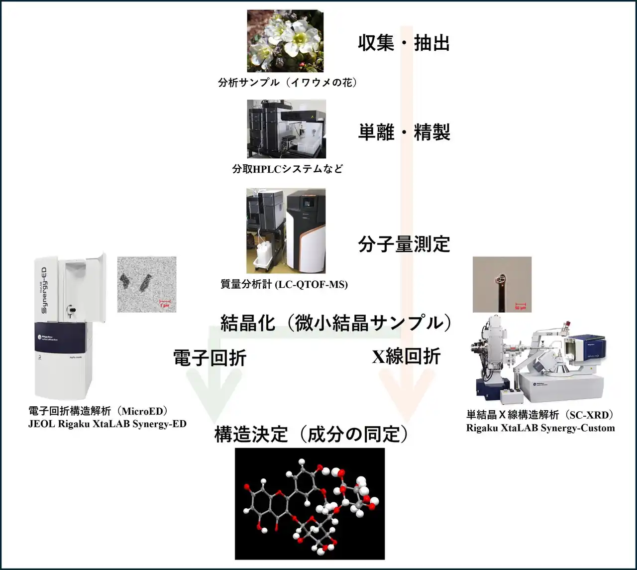 本研究チームでは、これまでにも微量なサンプルからの成分分析方法の開発を進めてきましたが、今回は高山植物のイワウメのごくわずかな花を研究サンプルとして、既存の分析手法である高速液体クロマトグラフ(HPLC)などによる単離・精製や四重極飛行時間型質量分析計(QTOF-MS)による分子量測定の工程後に、各含有成分の結晶化を最適化する方法を開発して、
