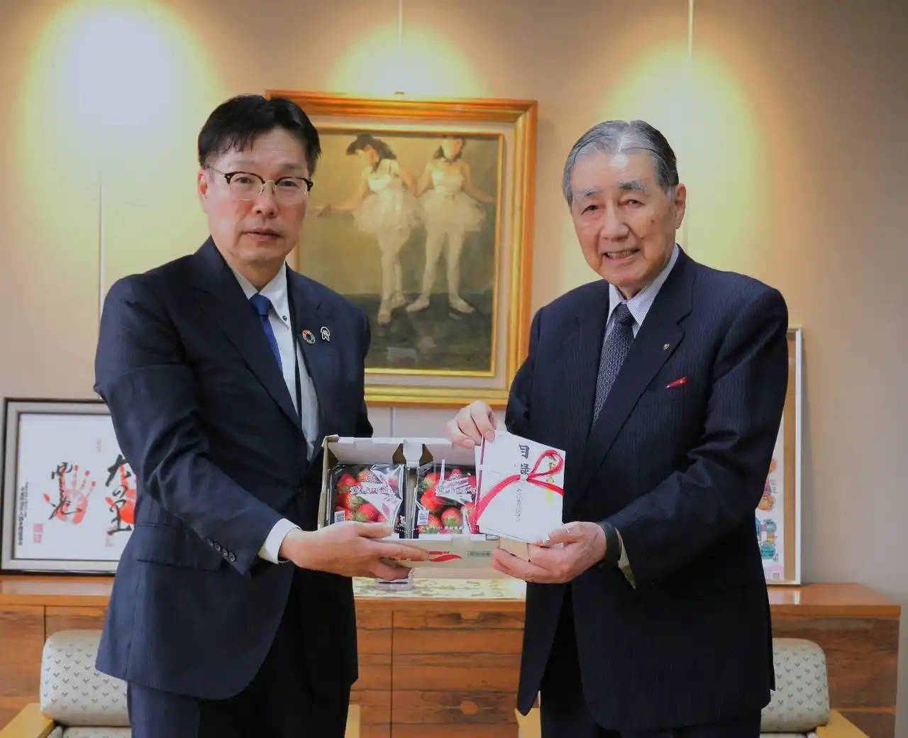 2026年2月27日、社会福祉法人中部善意銀行において寄贈式を行い、常務の柴田より目録といちごを寄贈しました。(寄贈式の様子/右:中部善意銀行理事長 岡田邦彦様 左:当会代表理事常務 柴田伸一) |