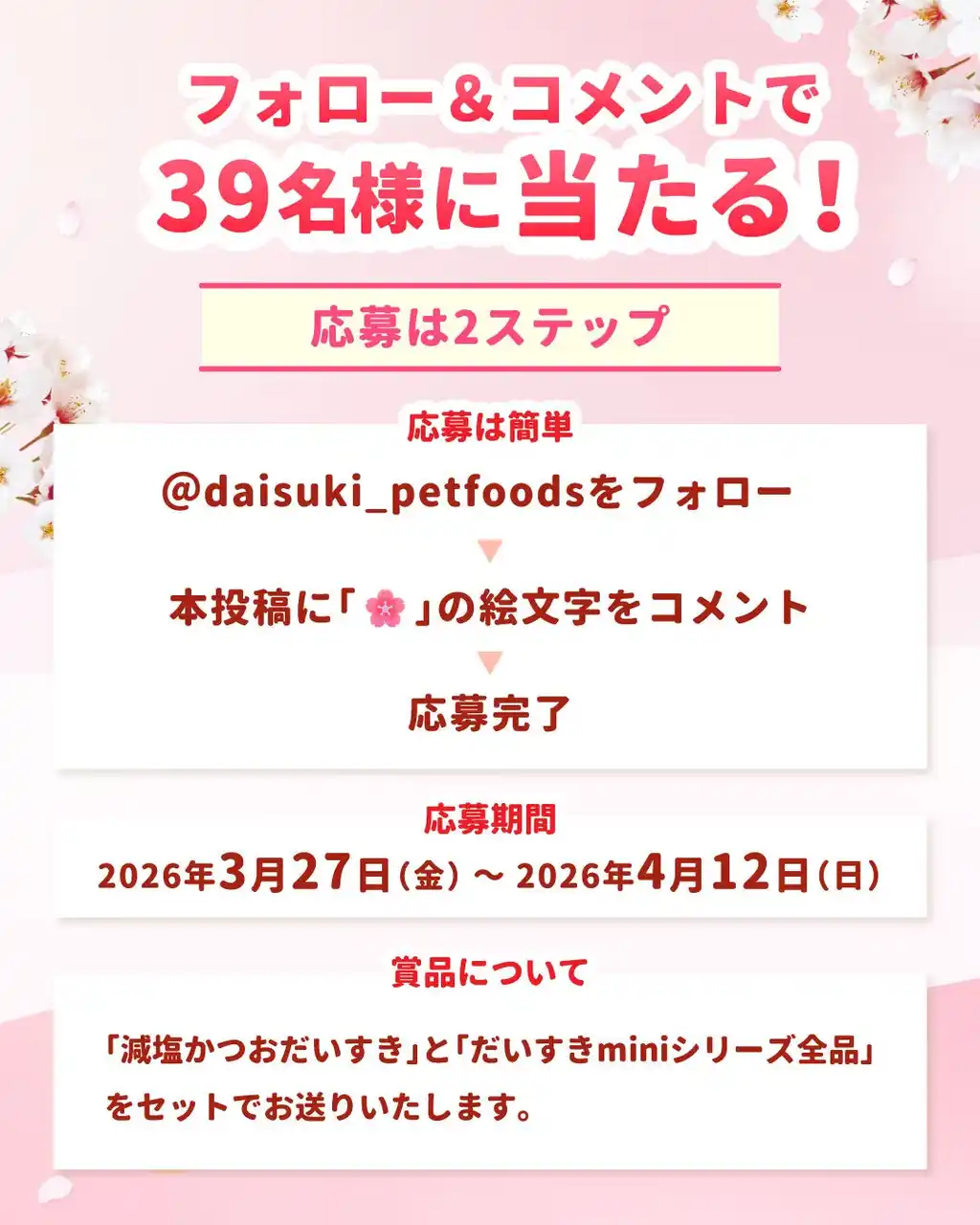 桜の開花宣言が全国各地で発表になるこの時期に、いつもだいすきシリーズを応援してくださるみなさんに感謝を込めて、春の感謝祭を企画しました。ねこちゃん・わんちゃんの健康を考えた大人気商品「減塩かつおだいすき」と、春のお出かけにも小さくて持ち運びやすい「だいすきミニシリーズ全種」をセットにして39(サンキュー!)名様にプレゼントします。ねこちゃん・わんちゃんとのお花見にもおすすめの「だいすきミニシリーズ」。この機会にぜひ、ご応募ください。 |