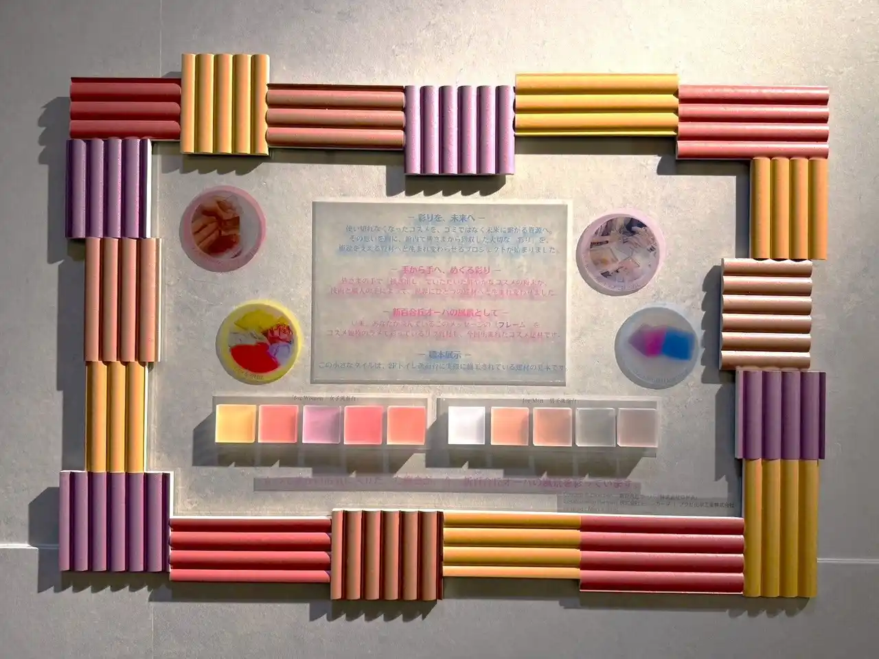 光の角度でラメやパールが煌めく「リブ形状のコスメ建材」のフレームに、2F男女トイレそれぞれの洗面台に採用された建材をミニタイルとして展示しました。 |