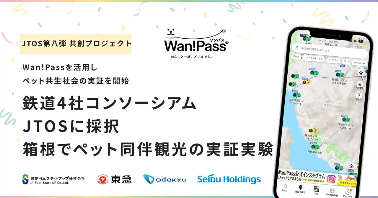 | ペットとのお出かけ支援アプリ「Wan!Pass(ワンパス)」を運営するペッツオーライ株式会社(本社:東京都中央区、代表取締役CEO:小早川 斉)は、東日本旅客鉄道株式会社のグループ会社でベンチャーへの出資・協業を推進するCVCのJR東日本スタートアップ株式会社、東急株式会社、小田急電鉄株式会社、株式会社西武ホールディングスの4社で構成される「鉄道横断型社会実装コンソーシアム「JTOS(ジェイトス)」の共創企業として採択されたことをお知らせします。 | |||