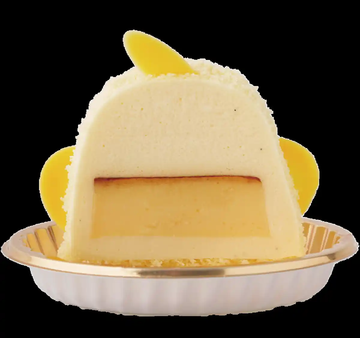 愛知県の地元食材「名古屋コーチン」の卵を使ったプリンを、バニラの香り豊かなババロアで包み込み、粉末状にしたスポンジをまとわせた、ふんわり「ひよこ」の形に飾り付けた生スイーツです。 |