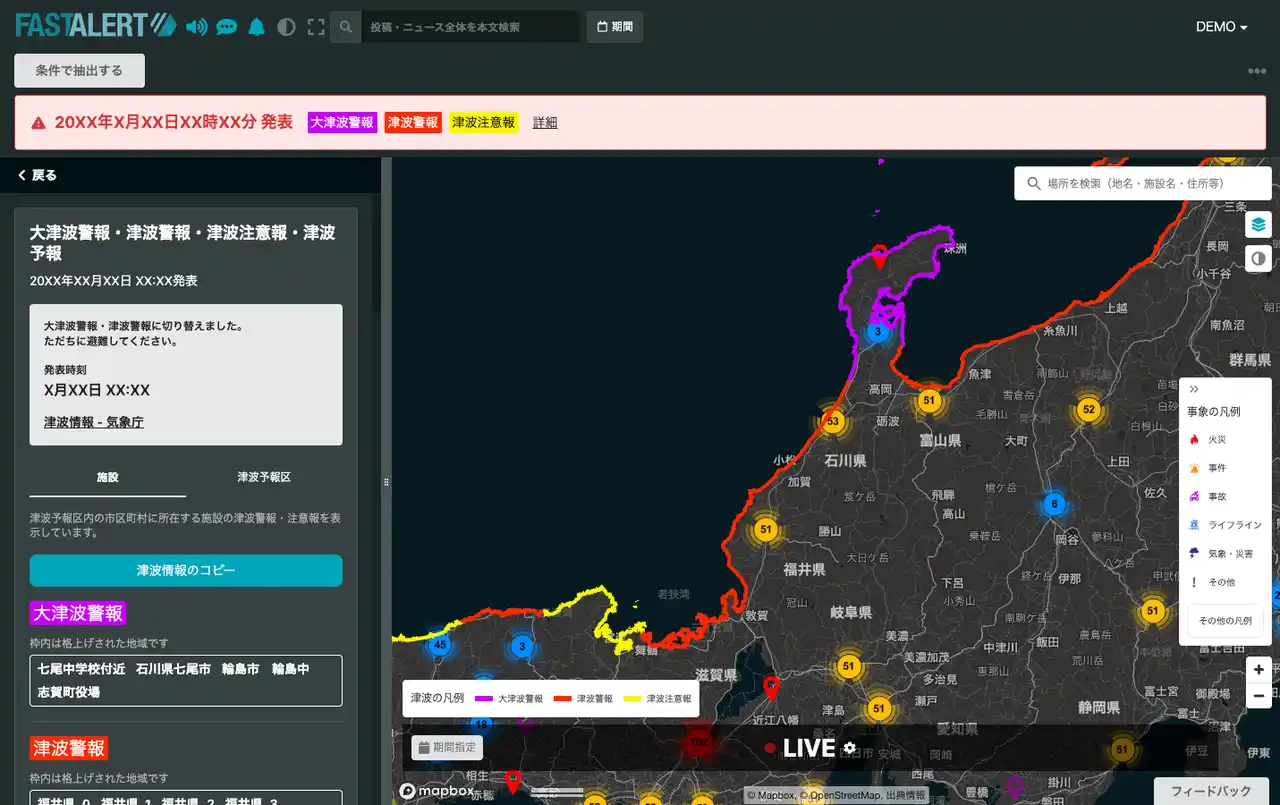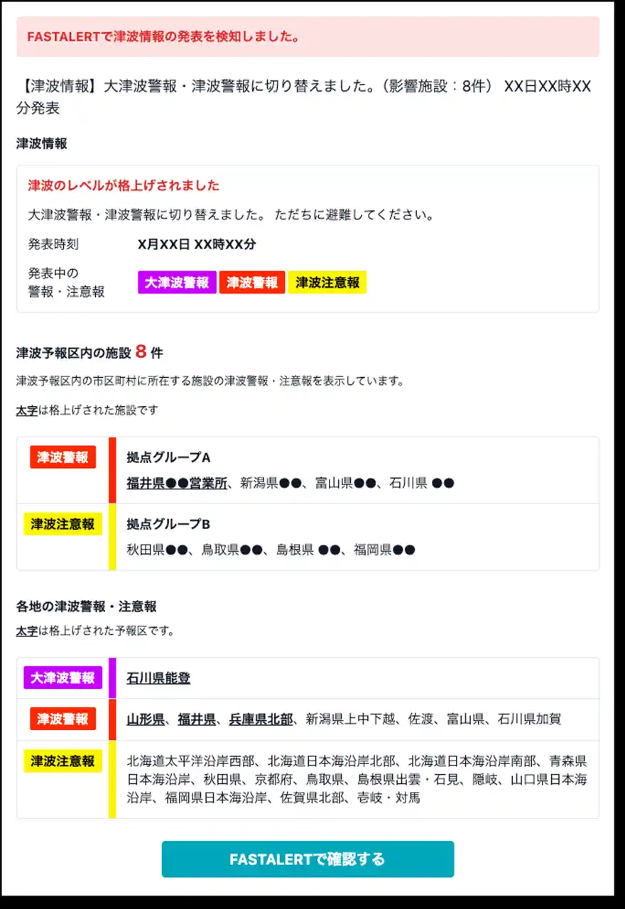 このような課題を解決するため、FASTALERTは各種リスク発生時の影響判断を支援する機能開発を行っております。その第一弾として、津波情報の可視化機能(発災マップへのリアルタイム描画や拠点ごとの自動抽出)の提供を開始いたします。 |