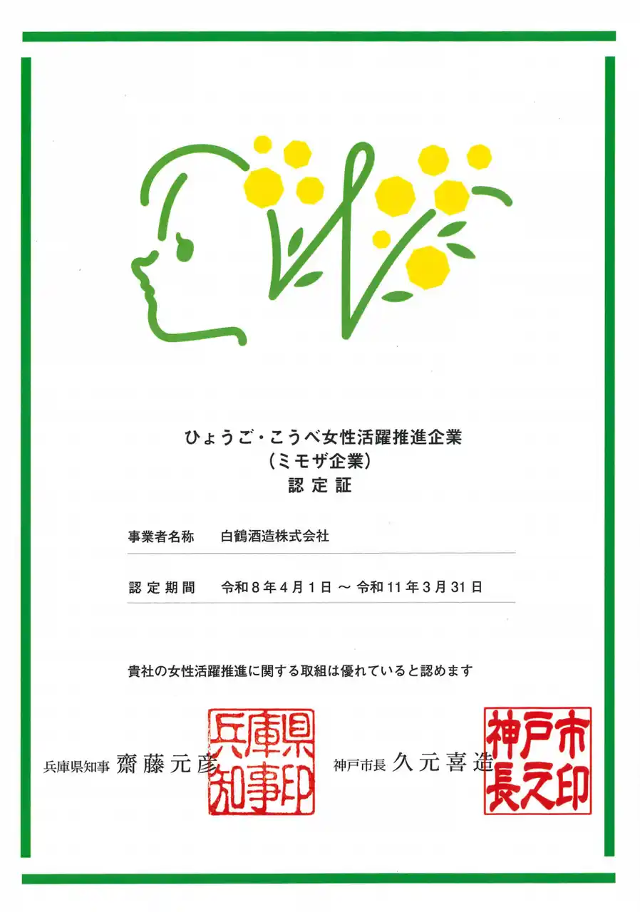 白鶴酒造株式会社は、兵庫県と神戸市が共同で創設した女性活躍推進の認定制度「ひょうご・こうべ女性活躍推進企業(ミモザ企業)」(※1)の認定を更新しました。当社は2023年3月に初回認定を取得、今回は兵庫県と神戸市が定める認定基準の20項目中19項目を達成して、再認定されました。 |