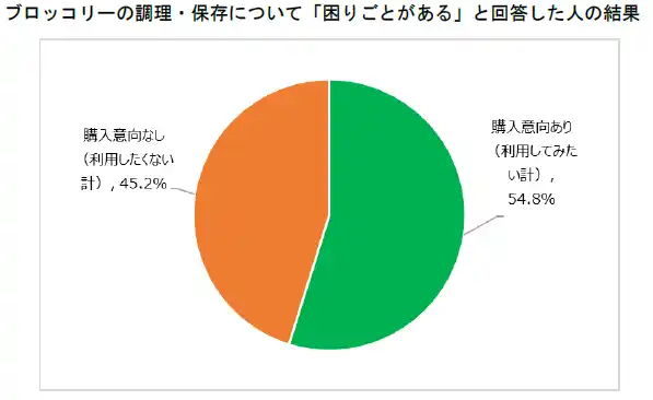 ブロッコリーの調理・保存に何らかの不満や困りごとがある層の54.8%が「そのままパクっとベジタブル」(パクベジ)を「利用してみたい」と回答しました。 |