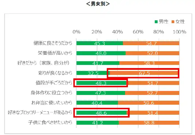 4. ブロッコリーの購入理由は「健康」「栄養価」が二大理由 女性は「彩り」、男性は「価格とメニュー」を重視 |